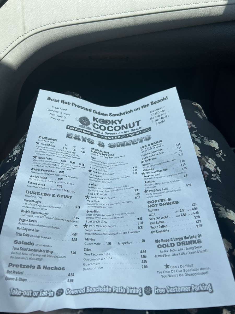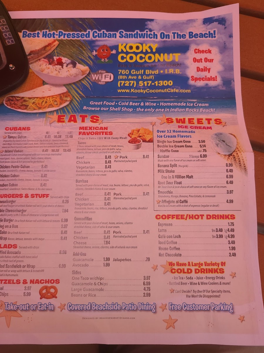 The menu at Kooky Coconut offers a relaxed blend of casual bites and refreshing treats, perfect for a laid-back day near the beach. With an emphasis on simple, satisfying flavors, the selection features a range of Cuban-inspired sandwiches, fresh tacos, and vibrant salads that suit lunch or an early dinner.